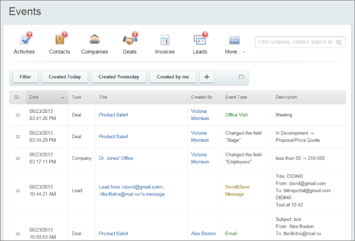 Events (CRM -> Events) menunjukkan perubahan yang dilakukan pada objek dalam CRM serta aktivitas (interaksi) yang terkait dengannya.