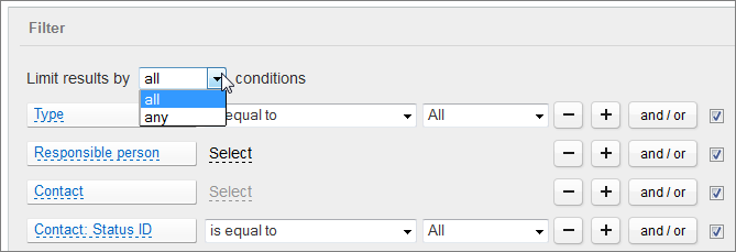 + Dan - memungkinkan penambahan kondisi tambahan ke filter atau menghapus kondisi yang ada. Saat beberapa kondisi dimasukkan, daftar drop-down muncul yang memungkinkan Anda memilih batasan hasil dalam laporan sesuai dengan semua, atau subset dari kondisi yang dipilih.