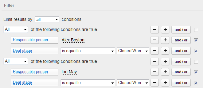 (Bertanggung jawab orang = Alex Boston dan Deal stage = Closed Won) atau (Bertanggung jawab = Ian May dan Deal stage = Closed Won).