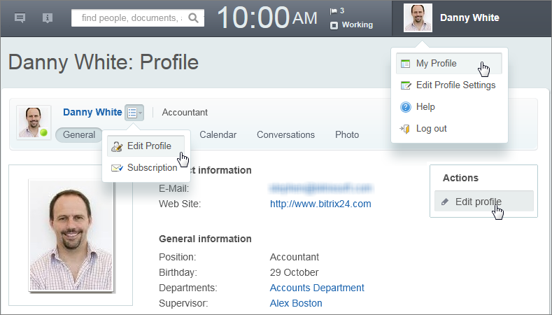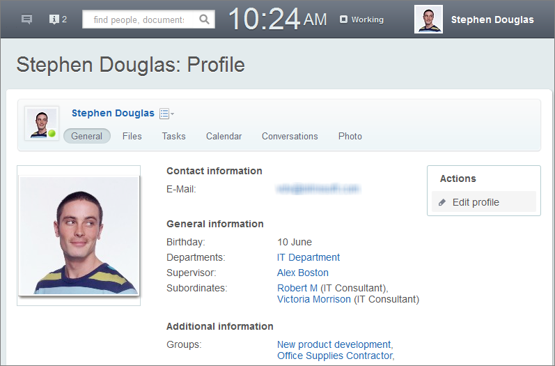 Gambar di atas adalah tampilan profil pengguna. Tautan file pengguna, kalender pribadi, pesan dan aset terkait profil karyawan lainnya ada di bagian atas halaman. Jika halaman profil yang sedang anda lihat adalah halaman profil anda sendiri, linknya sama seperti yang ditunjukkan pada menu di sebelah kiri halaman.