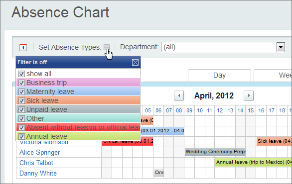 Awalnya, bagan absen berisi data untuk semua karyawan yang tidak tersedia. Jika diperlukan, Anda dapat melihat laporan di departemen tertentu: pilih dalam daftar drop-down pada toolbar konteks.