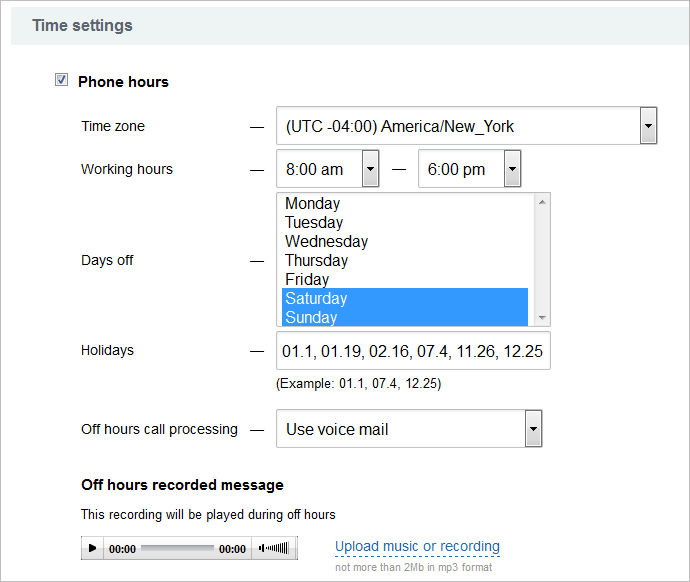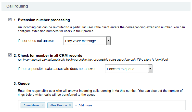 Call routing memungkinkan untuk membangun antrian karyawan di antara mana panggilan masuk akan didistribusikan. Nada dering dapat ditetapkan untuk setiap jenis operasi panggilan.