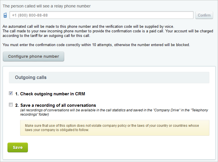Setelah nomor disewakan atau SIP PBX terhubung, nomor-nomor ini dapat diatur agar dapat bekerja dengan Bitrix24 Telephony> Nomor Telepon> Menyusun nomor> Mengkonfigurasi nomor. Ini termasuk routing panggilan dan nada dering.