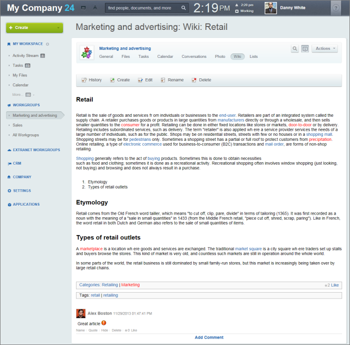 Di Bitrix24, masing-masing kelompok kerja memiliki wiki. Dengan demikian, untuk menciptakan basis pengetahuan yang bisa diakses semua orang, gunakan wiki dalam kelompok publik. Anda dapat menggunakan peran dalam grup jika karena alasan apa pun Anda ingin hanya memberikan hak akses baca kepada pengguna tertentu.